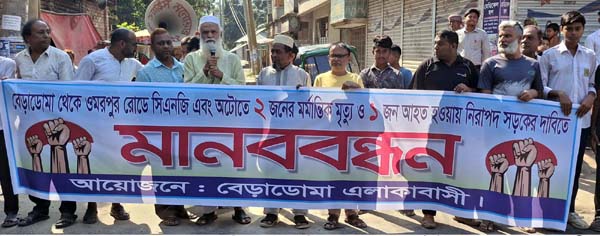 টাঙ্গাইল পৌরসভার বেড়াডোমা এলাকায় সড়ক দুর্ঘটনায় চলতি সপ্তাহে দুজনের মৃত্যুর পর সড়কে গতিরোধের দাবিতে মানববন্ধন